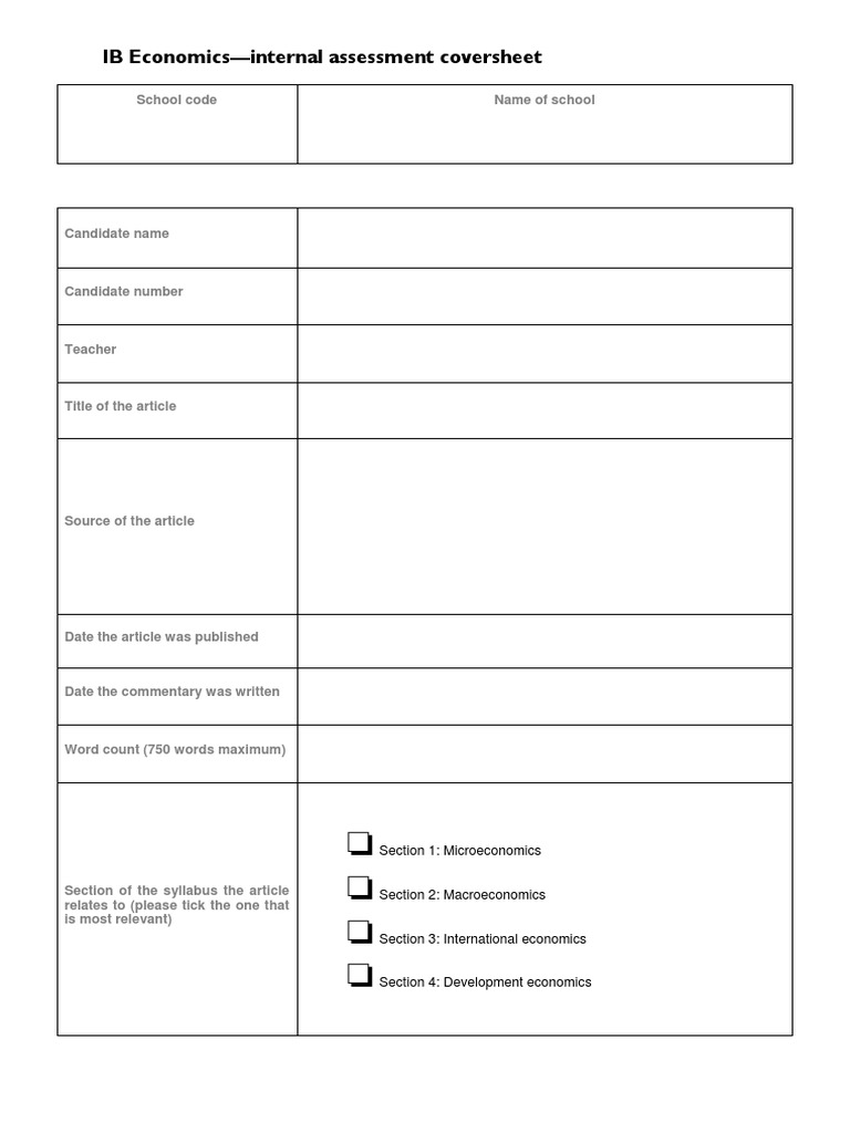 IB Economics internal assessment cover sheet Title of the article Subsidy. Up to 3 cash back Economics Cover Sheet1 - Free download as PDF File pdf Text. IB Economicsinternal assessment coversheet School code Name of school Candidate.